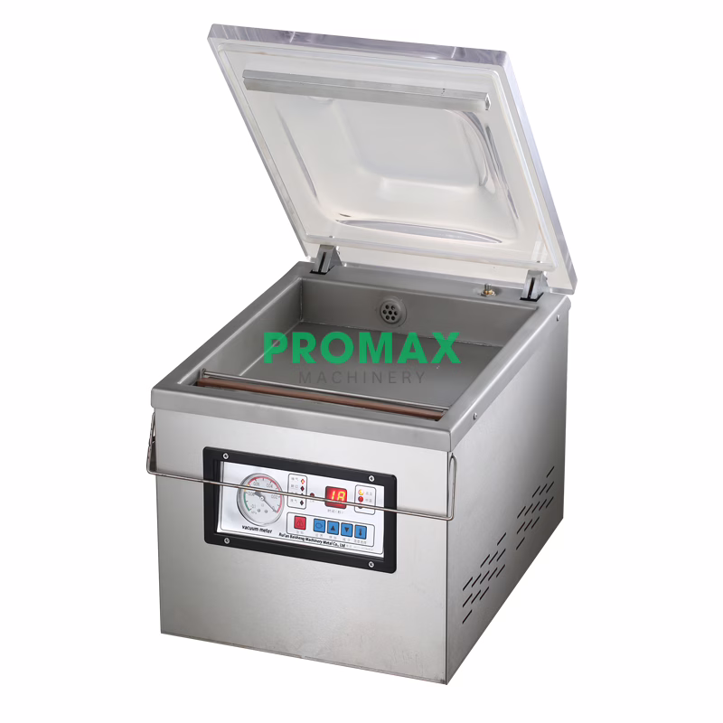 เป็นเครื่องซีลสูญญากาศ แบบตั้งโต๊ะโครงสร้างทำด้วยแสตนเลส เชื่อมขึ้นรูปห้องสูญญากาศไร้รอยต่อ ทนทาน กันสนิม สามารถใช้งานติดต่อกันได้ 6 ชั่วโมงต่อเนื่อง ห้องแพ็คสูญญากาศ จำนวน 1 ห้อง มีขนาดแท่งซีลยาว 26 CM. จำนวน 1 แถบซีล ระบบการตั้งค่าแสดงด้วยระบบดิจิตอล 10 โปรแกรม ตั้งค่าการดูดอากาศ การซีล การทำให้เย็น โดยสามารถตั้งค่าได้หลากหลายให้เหมาะสมกับสินค้าและบรรจุภัณฑ์