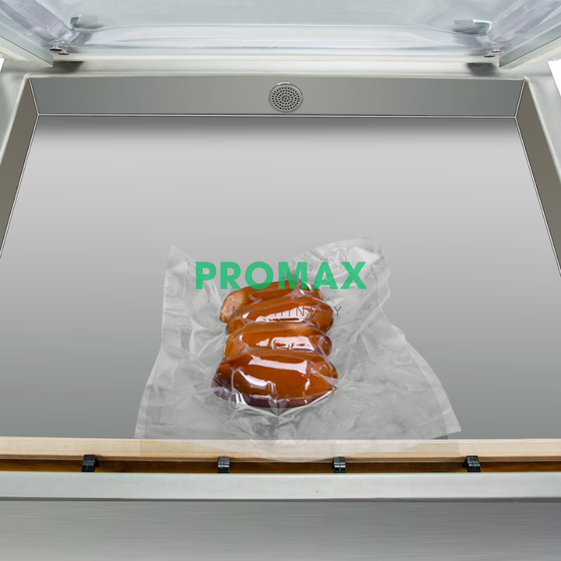 การซีลสูญญากาศห้องซีลขนาดใหญ่ : ออกแบบให้ดูดอากาศออกจากถุงได้หมด ทำให้การซีลแน่นสมบูรณ์ ยืดอายุการเก็บสินค้า